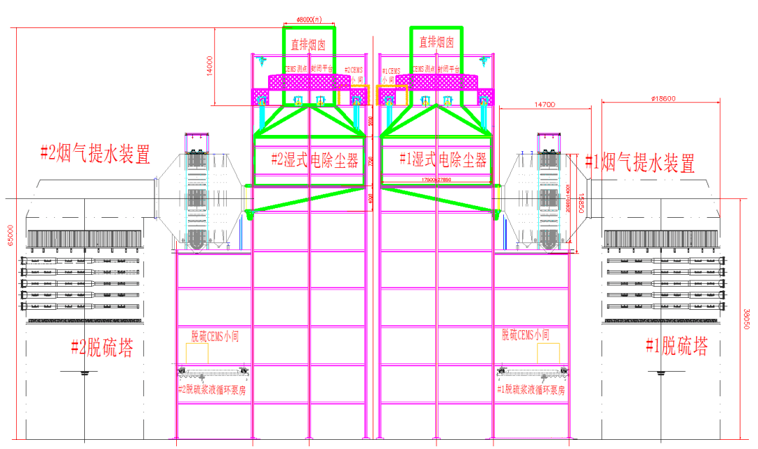 脱硫除尘一体化系统布置于塔中心区域,完成脱硫、除尘功能。